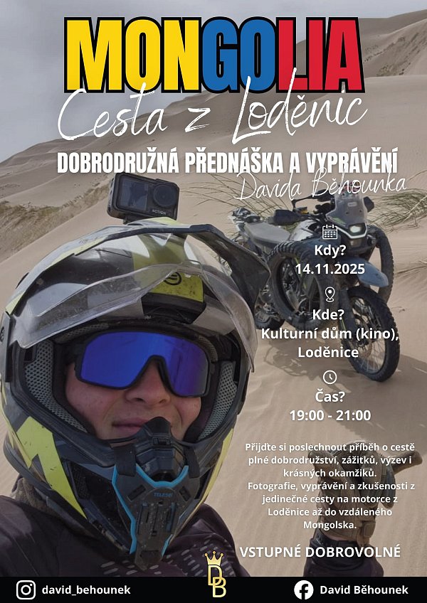 Přijďte si poslechnout příběh o cestě plné dobrodružství, zážitků, výzev i krásných okamžiků. Fotografie, vyprávění a zkušenosti z jedinečné cesty na motorce z Loděnice až do vzdáleného Mongolska.