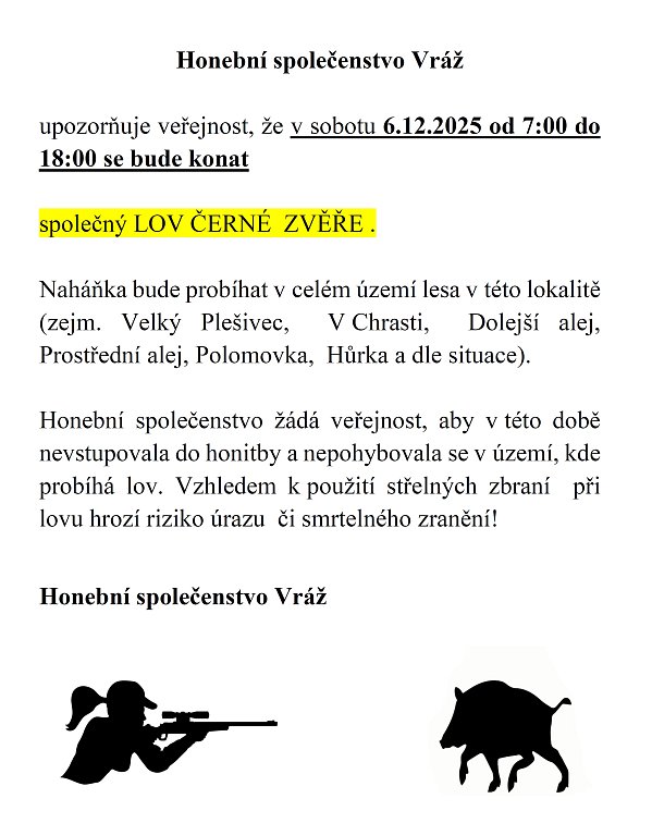Honební společensvo Vráž upozorňuje veřejnost, že v sobotu 6. prosince 2025 od 7:00 do 18:00 se bude konat společný LOV ČERNÉ ZVĚŘE.